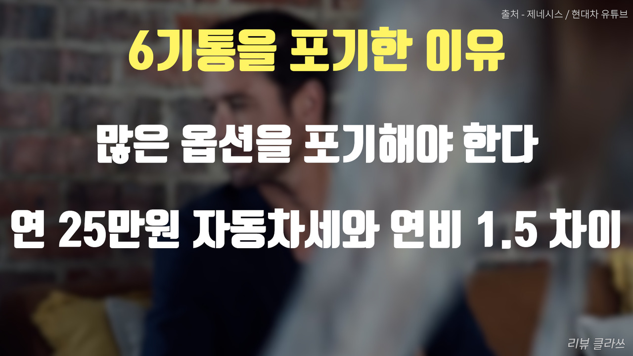 6기통의 장점으로는 진동 및 소음이 적고 차원이 다른 주행질감입니다. 또한 G80 은 3.5T 6기통을 선택시에 브레이크 4P 가 기본 장착됩니다. 하지만 애초에 정해놓은 상한금액과 자동차세 및 연비 등 유지비 때문에 2.5T 4기통 모델을 선택하였습니다. 10년 후 다음 차를 구매하게 되면 그때는 전기차 세상이 올 거라는 생각에 지금이야말로 내연기관차를 구매하는 마지막 기회가 될 거라고 생각했습니다. 그래서 꼭 한번은 느껴 보고 싶은 6기통의 매력때문에 3.5 터보 모델을 구매할까 고민이 정말 많았습니다. 우선 6기통의 장점으로는, 실제로 사용하다 보면 4기통의 경우 소음과 진동이 커진다고 합니다. 그에 반에 6기통은 상당히 정숙한 편인데요. 이에 따라 G800 스탑앤고 (ISG) 기능도 더욱 더 부드럽게 구현 되지 않을까 싶습니다. 브레이크 4P 가 기본 장착 되어 더욱 더 고급스러운 느낌을 줍니다. 또한 그리고 수많은 유튜브와 리뷰어들이 6기통과 4기통은 차원이 다르다 며 극찬을 하였습니다.