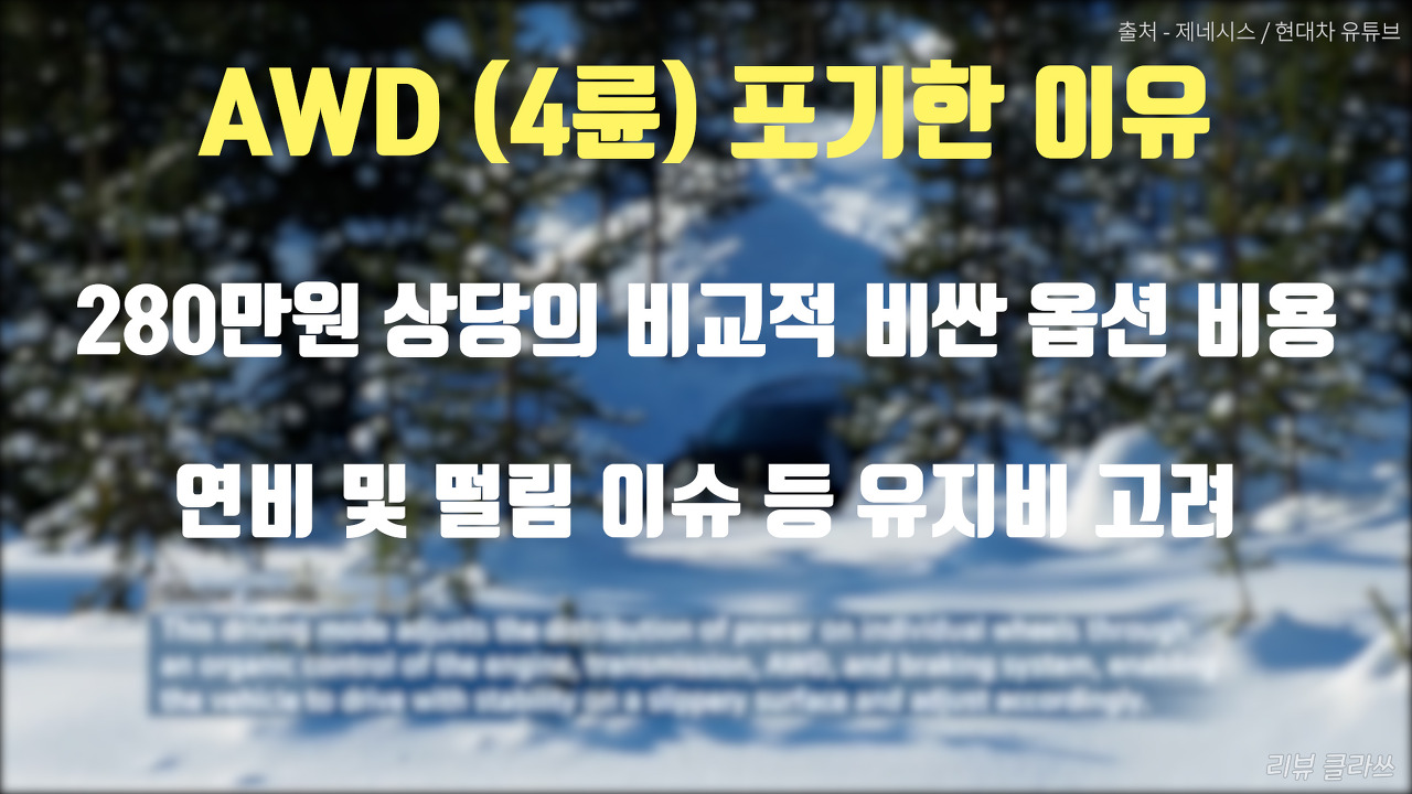 또한 AWD 4륜은 2륜대비 비싼 옵션가격과 연비 및 떨림 이슈 등 유지비도 고려해야만 했습니다다음은 구동 타입 선택입니다. 이 옵션은 유일하게 제가 처음부터 끝까지 고민하지 않았던 옵션입니다. 4륜 AW 장점은 여러가지가 있겠지만
