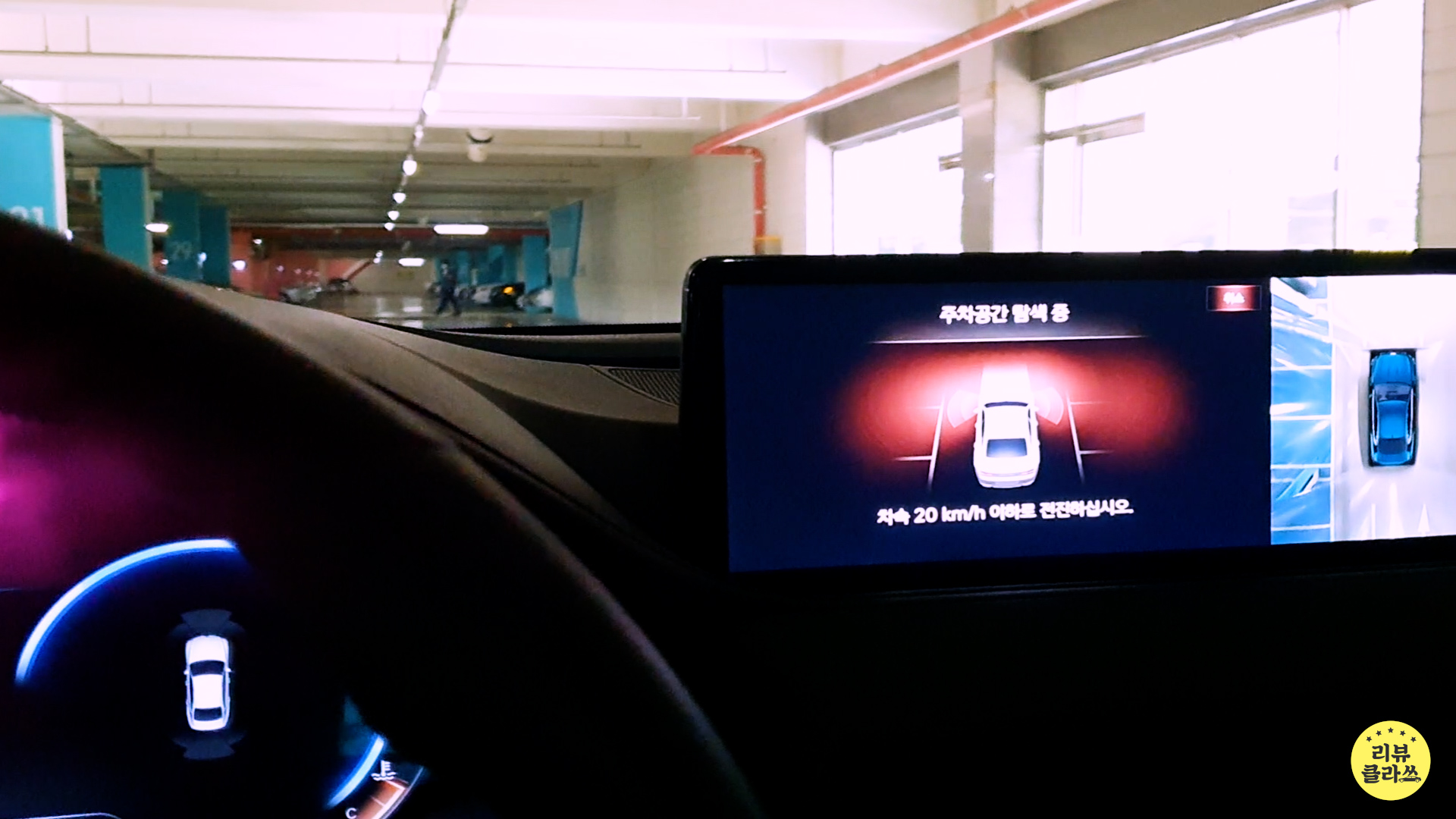 전면 인포테인먼트 화면이 서라운드 화면과 함께 주차공간을 탐색 중이라고 뜹니다.