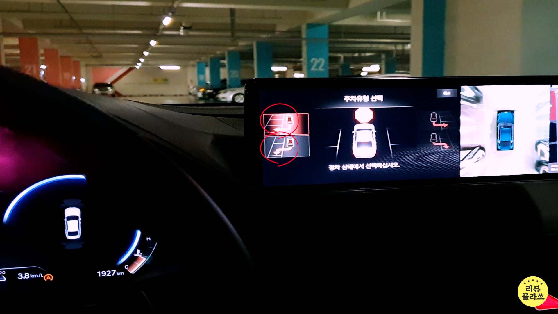 다음으로 차에서 내려서 주차하는 원격주차와, 차안에서 자동주차하는 스마트 주차를 선택하는 화면이 나오는데 얼마나 멋지게 주차를 할지 궁금해서 실내에서 지켜보기로 했습니다.